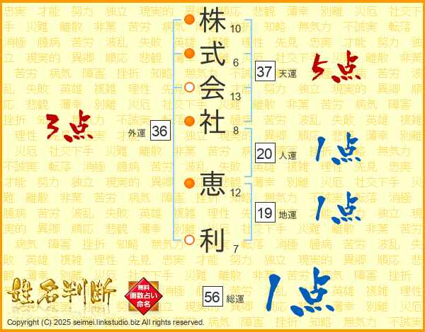 株(10画)式(6画)会(13画)社(8画) 恵(12画)利(7画)