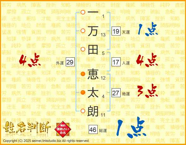 一(1画)万(13画)田(5画) 恵(12画)太(4画)朗(11画)