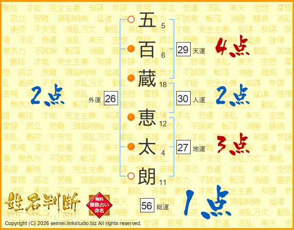 五(5画)百(6画)蔵(18画) 恵(12画)太(4画)朗(11画)