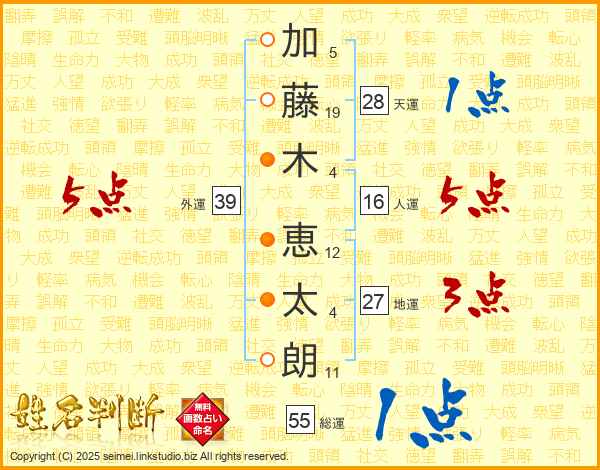 加(5画)藤(19画)木(4画) 恵(12画)太(4画)朗(11画)
