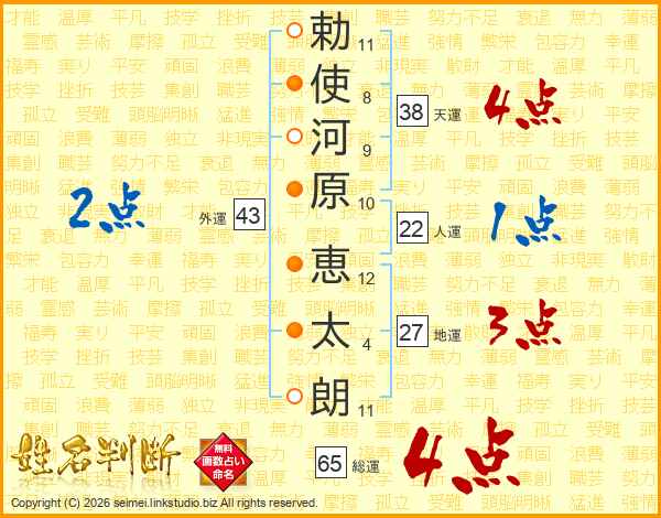 勅(11画)使(8画)河(9画)原(10画) 恵(12画)太(4画)朗(11画)