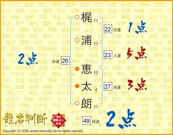 梶(11画)浦(11画) 恵(12画)太(4画)朗(11画)
