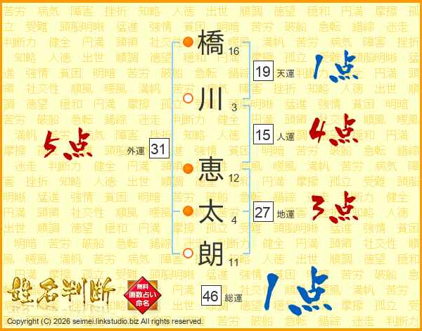 橋(16画)川(3画) 恵(12画)太(4画)朗(11画)