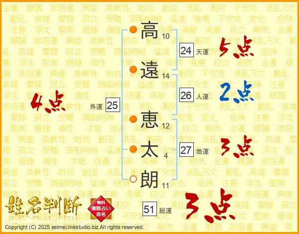 高(10画)遠(14画) 恵(12画)太(4画)朗(11画)