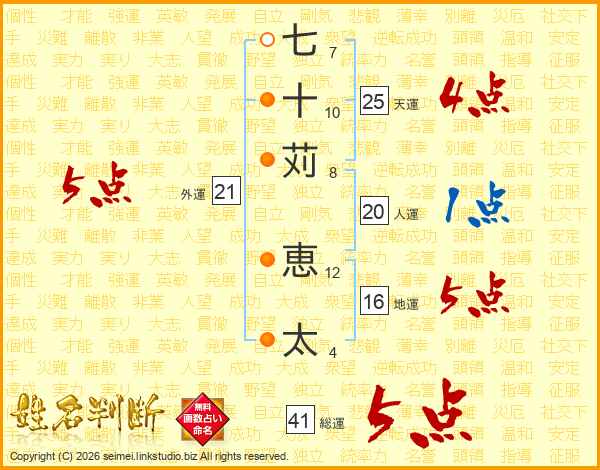 七(7画)十(10画)苅(8画) 恵(12画)太(4画)