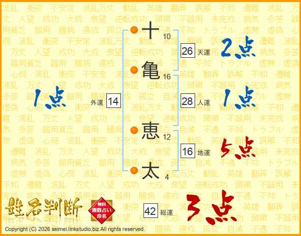 十(10画)亀(16画) 恵(12画)太(4画)
