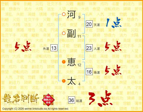 生活面を象徴する運勢です。外部から受ける影響力を表し、結婚運、家庭運や職場、環境への順応性を表します。総運から人運を引いた画数。姓や名が1文字の場合を除く。