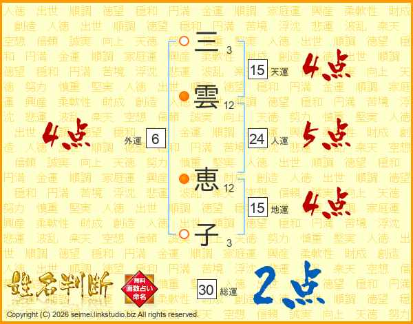 三(3画)雲(12画) 恵(12画)子(3画)