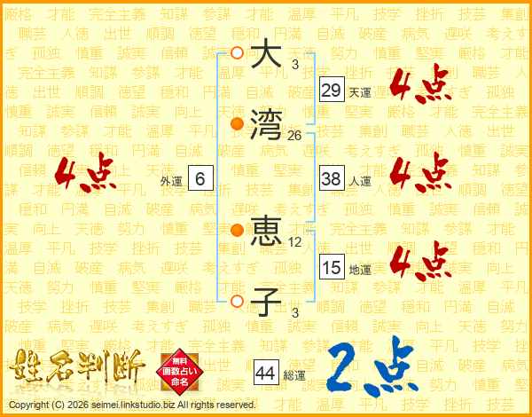 生活面を象徴する運勢です。外部から受ける影響力を表し、結婚運、家庭運や職場、環境への順応性を表します。総運から人運を引いた画数。姓や名が1文字の場合を除く。