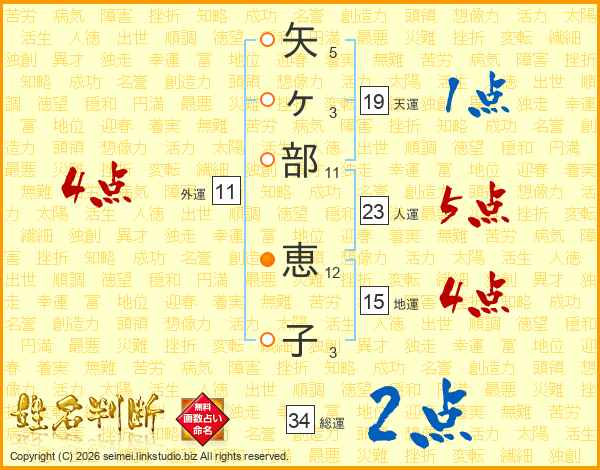 矢(5画)ヶ(3画)部(11画) 恵(12画)子(3画)