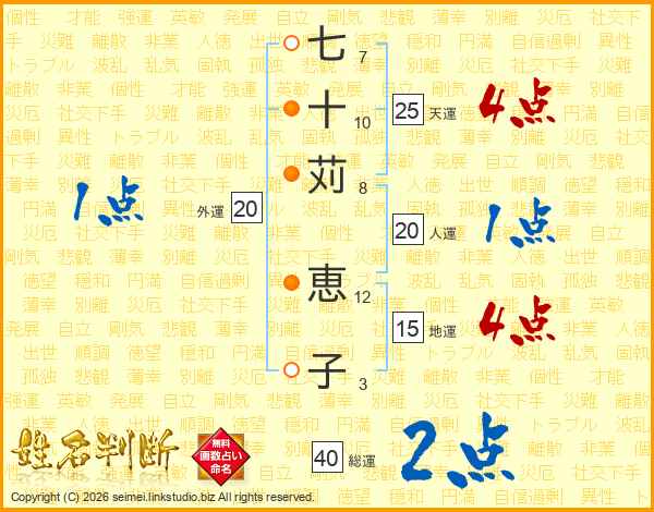 七(7画)十(10画)苅(8画) 恵(12画)子(3画)