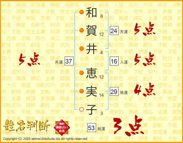 和(8画)賀(12画)井(4画) 恵(12画)実(14画)子(3画)