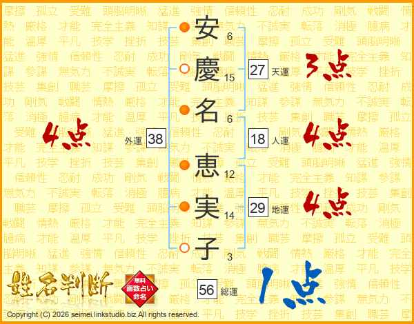 安(6画)慶(15画)名(6画) 恵(12画)実(14画)子(3画)
