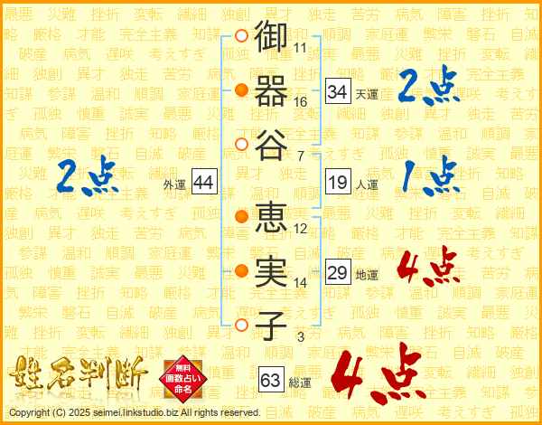 御(11画)器(16画)谷(7画) 恵(12画)実(14画)子(3画)
