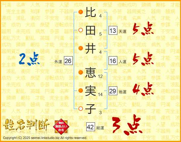 比(4画)田(5画)井(4画) 恵(12画)実(14画)子(3画)