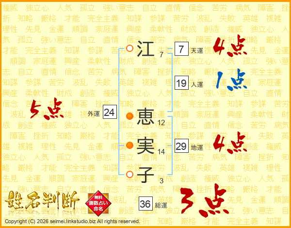 生活面を象徴する運勢です。外部から受ける影響力を表し、結婚運、家庭運や職場、環境への順応性を表します。総運から人運を引いた画数。姓や名が1文字の場合を除く。
