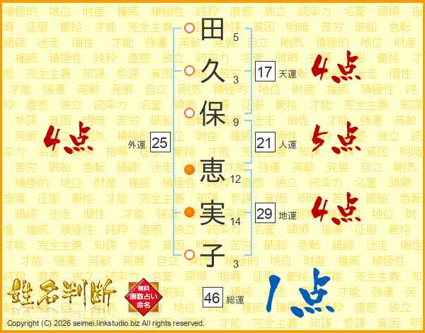 田(5画)久(3画)保(9画) 恵(12画)実(14画)子(3画)