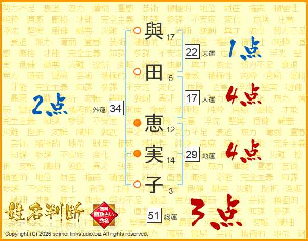 與(17画)田(5画) 恵(12画)実(14画)子(3画)
