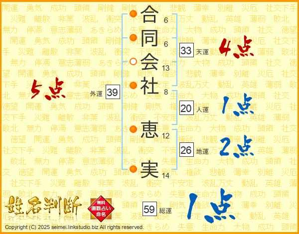 合(6画)同(6画)会(13画)社(8画) 恵(12画)実(14画)