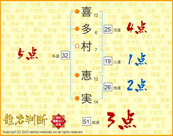 喜(12画)多(6画)村(7画) 恵(12画)実(14画)