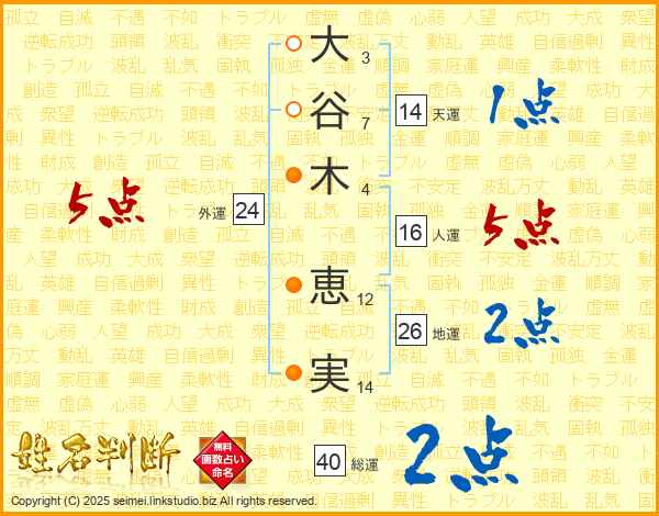大(3画)谷(7画)木(4画) 恵(12画)実(14画)