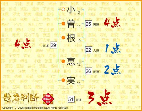 小(3画)曽(12画)根(10画) 恵(12画)実(14画)