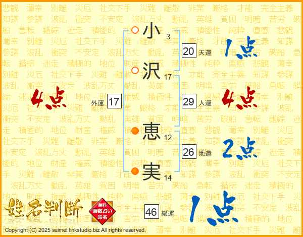 生活面を象徴する運勢です。外部から受ける影響力を表し、結婚運、家庭運や職場、環境への順応性を表します。総運から人運を引いた画数。姓や名が1文字の場合を除く。