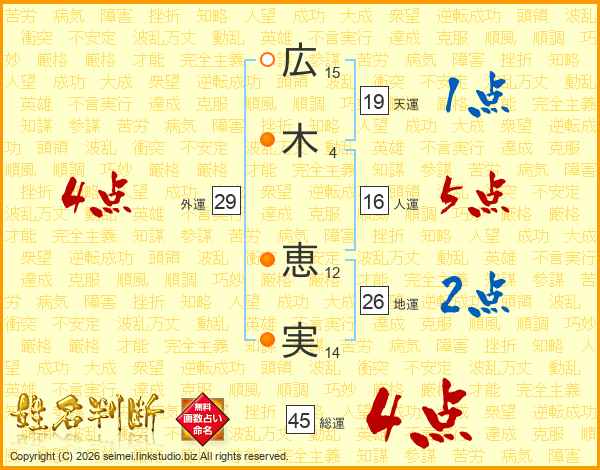 広(15画)木(4画) 恵(12画)実(14画)