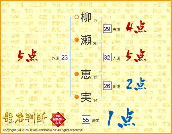 柳(9画)瀬(20画) 恵(12画)実(14画)