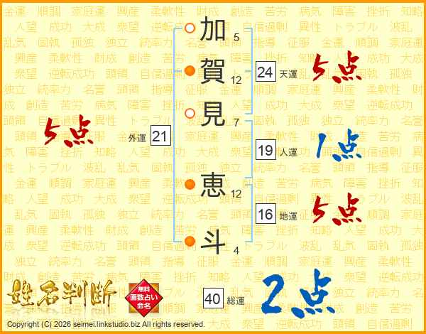 加(5画)賀(12画)見(7画) 恵(12画)斗(4画)
