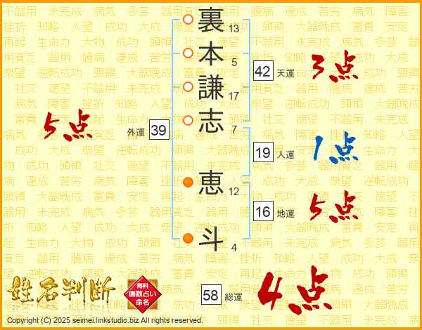 裏(13画)本(5画)謙(17画)志(7画) 恵(12画)斗(4画)