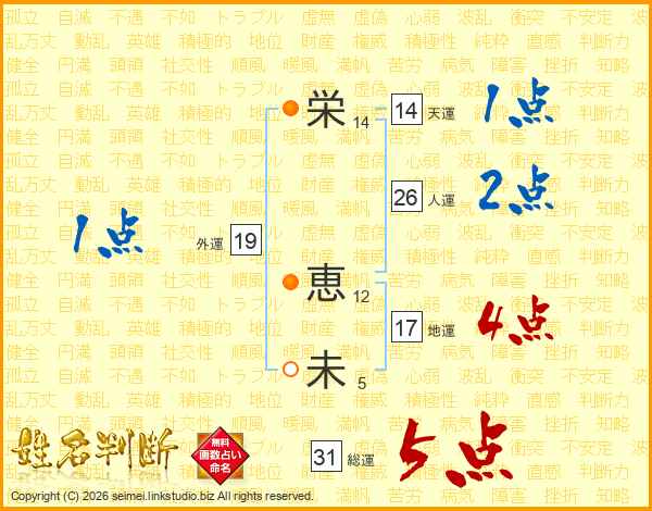 生活面を象徴する運勢です。外部から受ける影響力を表し、結婚運、家庭運や職場、環境への順応性を表します。総運から人運を引いた画数。姓や名が1文字の場合を除く。