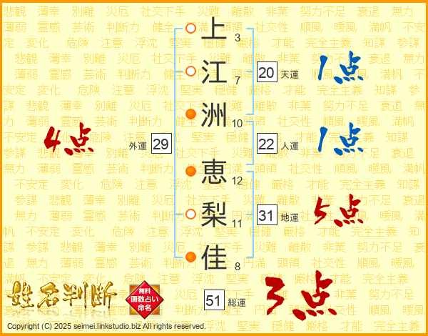 上(3画)江(7画)洲(10画) 恵(12画)梨(11画)佳(8画)