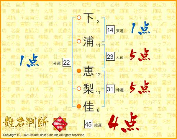 下(3画)浦(11画) 恵(12画)梨(11画)佳(8画)