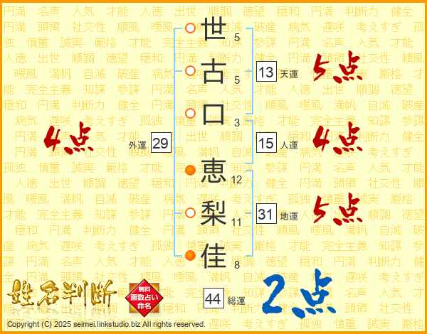 世(5画)古(5画)口(3画) 恵(12画)梨(11画)佳(8画)