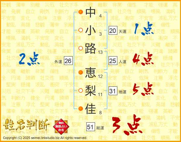中(4画)小(3画)路(13画) 恵(12画)梨(11画)佳(8画)