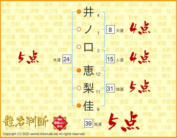 井(4画)ノ(1画)口(3画) 恵(12画)梨(11画)佳(8画)