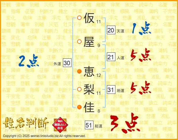 仮(11画)屋(9画) 恵(12画)梨(11画)佳(8画)