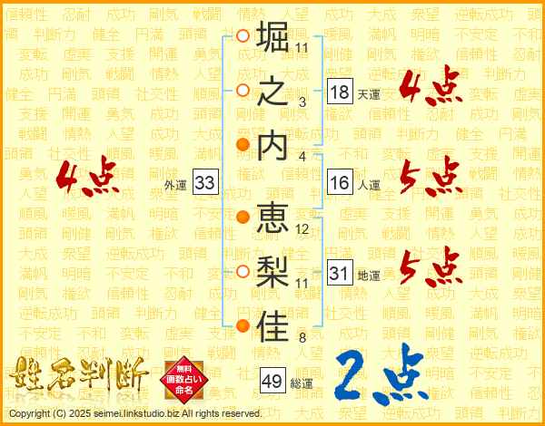 堀(11画)之(3画)内(4画) 恵(12画)梨(11画)佳(8画)