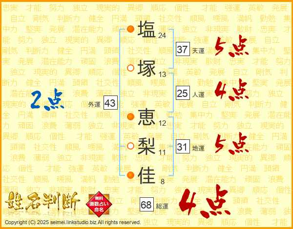 塩(24画)塚(13画) 恵(12画)梨(11画)佳(8画)