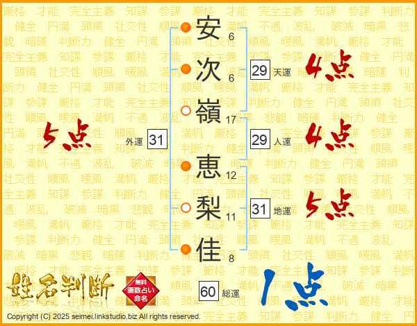 安(6画)次(6画)嶺(17画) 恵(12画)梨(11画)佳(8画)