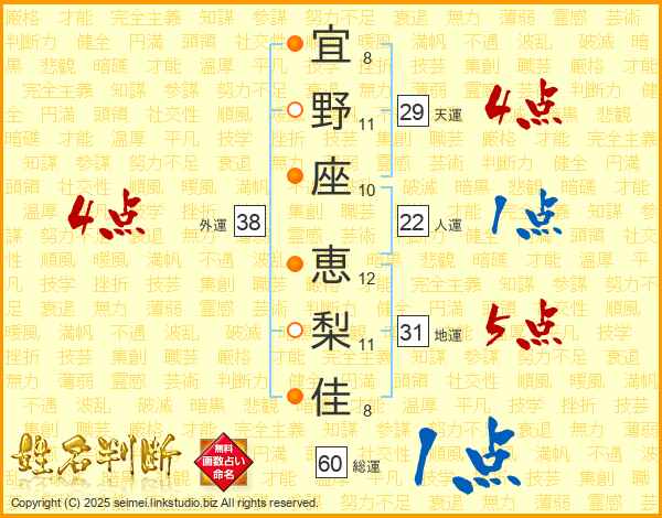 宜(8画)野(11画)座(10画) 恵(12画)梨(11画)佳(8画)