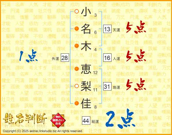 小(3画)名(6画)木(4画) 恵(12画)梨(11画)佳(8画)
