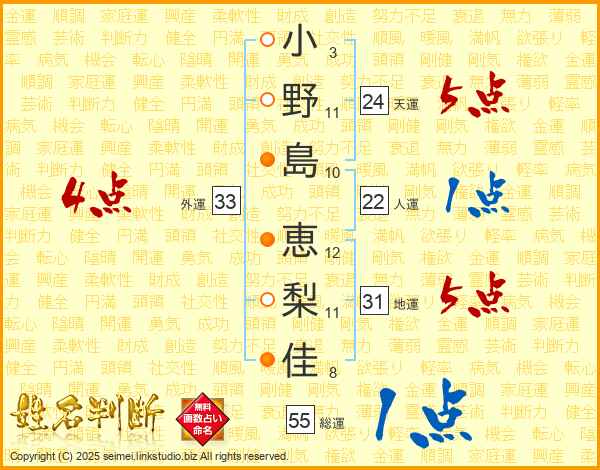 小(3画)野(11画)島(10画) 恵(12画)梨(11画)佳(8画)
