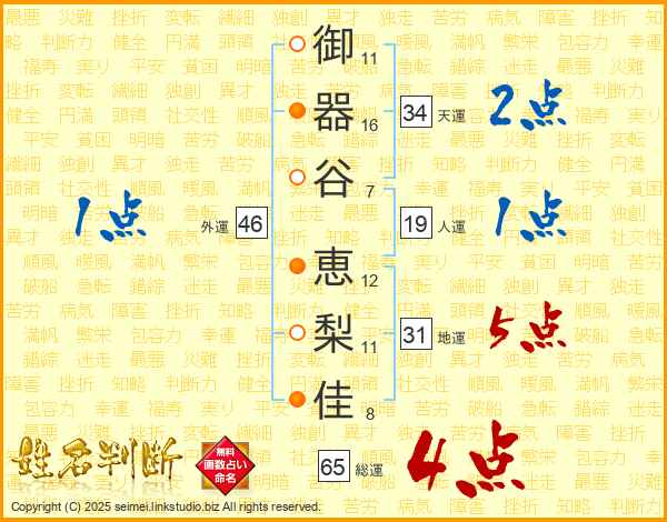 御器谷恵梨佳さんの総運は65画の4点!