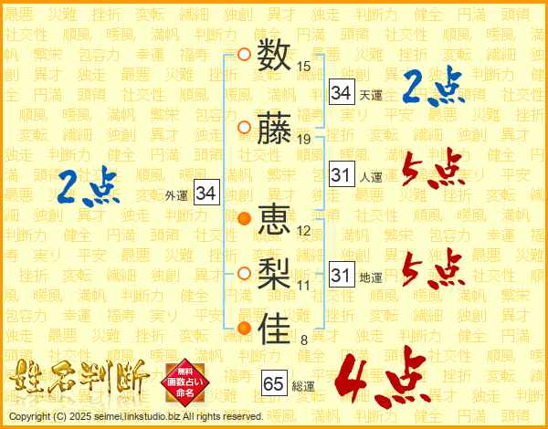 数(15画)藤(19画) 恵(12画)梨(11画)佳(8画)