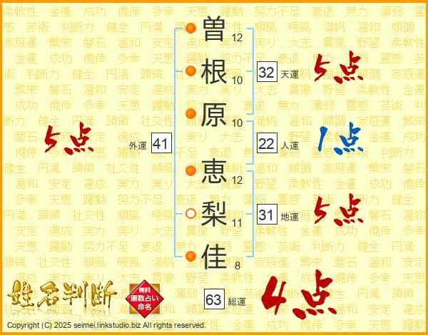 曽(12画)根(10画)原(10画) 恵(12画)梨(11画)佳(8画)