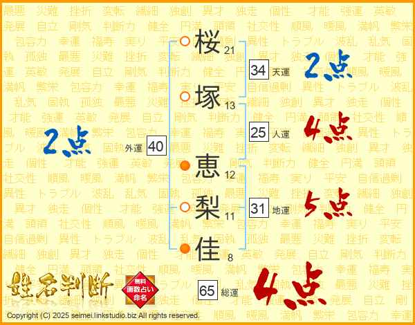 桜(21画)塚(13画) 恵(12画)梨(11画)佳(8画)