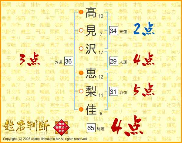 高(10画)見(7画)沢(17画) 恵(12画)梨(11画)佳(8画)