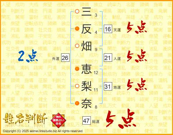 三(3画)反(4画)畑(9画) 恵(12画)梨(11画)奈(8画)